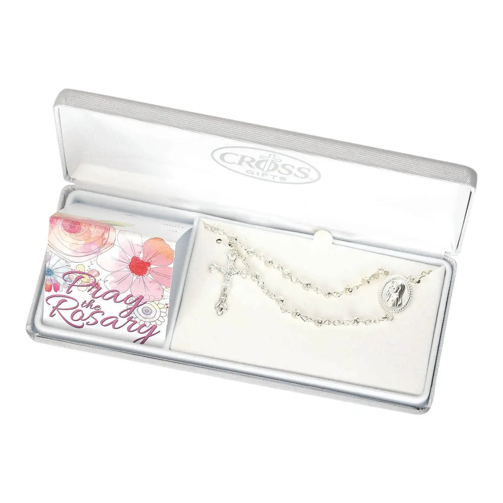 The petite 1/8" silver plated open filigree beads on this rosary are textured for a softly sparkling appearance. Madonna's centerpiece medallion and crucifix are silver plated. Rosary 18"L, centerpiece 11/16"L; crucifix 1 1/8"L. Comes in a deluxe white fabric covered presentation box with folded tent card that has "Pray the Rosary" art on the front and a poem inside. To and From spaces are on the back for writing in names. Text of poem: Each time I pray the rosary, I ponder what Christ did for me. He lived a sinless, perfect life, that ended in His sacrifice. And though He died, He rose again, because of God's great love for man. I'm reminded when I pray, He's the life, the truth, and the way.