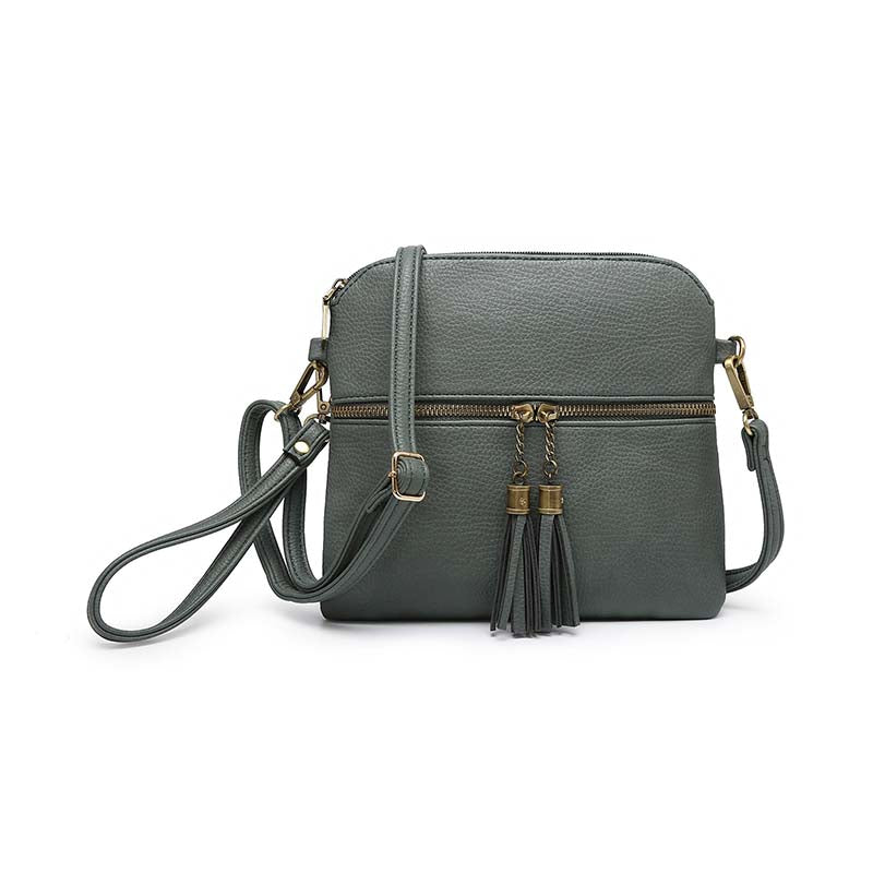This two-tone, zippered bag has a removable/adjustable shoulder strap, gold-tone hardware, and a zipper top closure. It also has plenty of pockets! Dimensions: 9.5"L x 0.5"D x 9"H