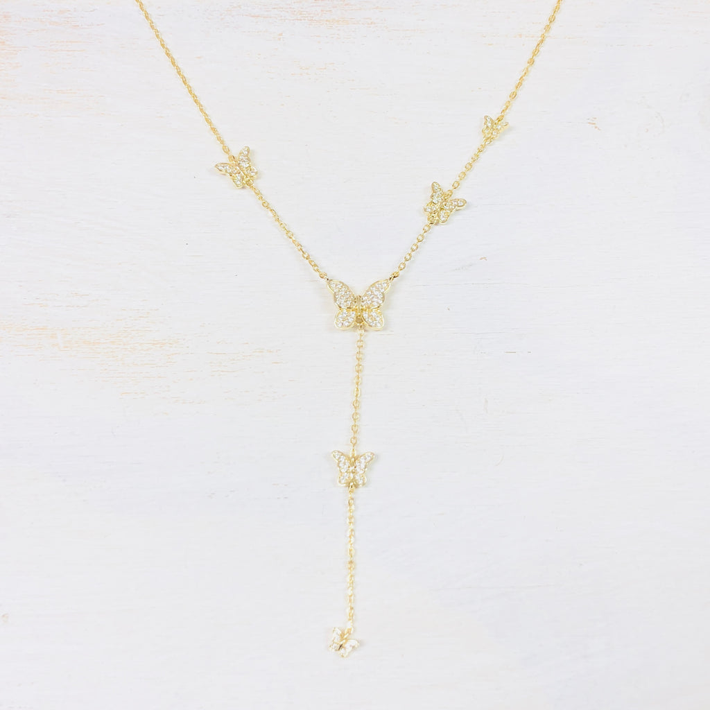 Sterling Silver Butterfly Y-Chain Necklace- CZ w/ Gold Plate