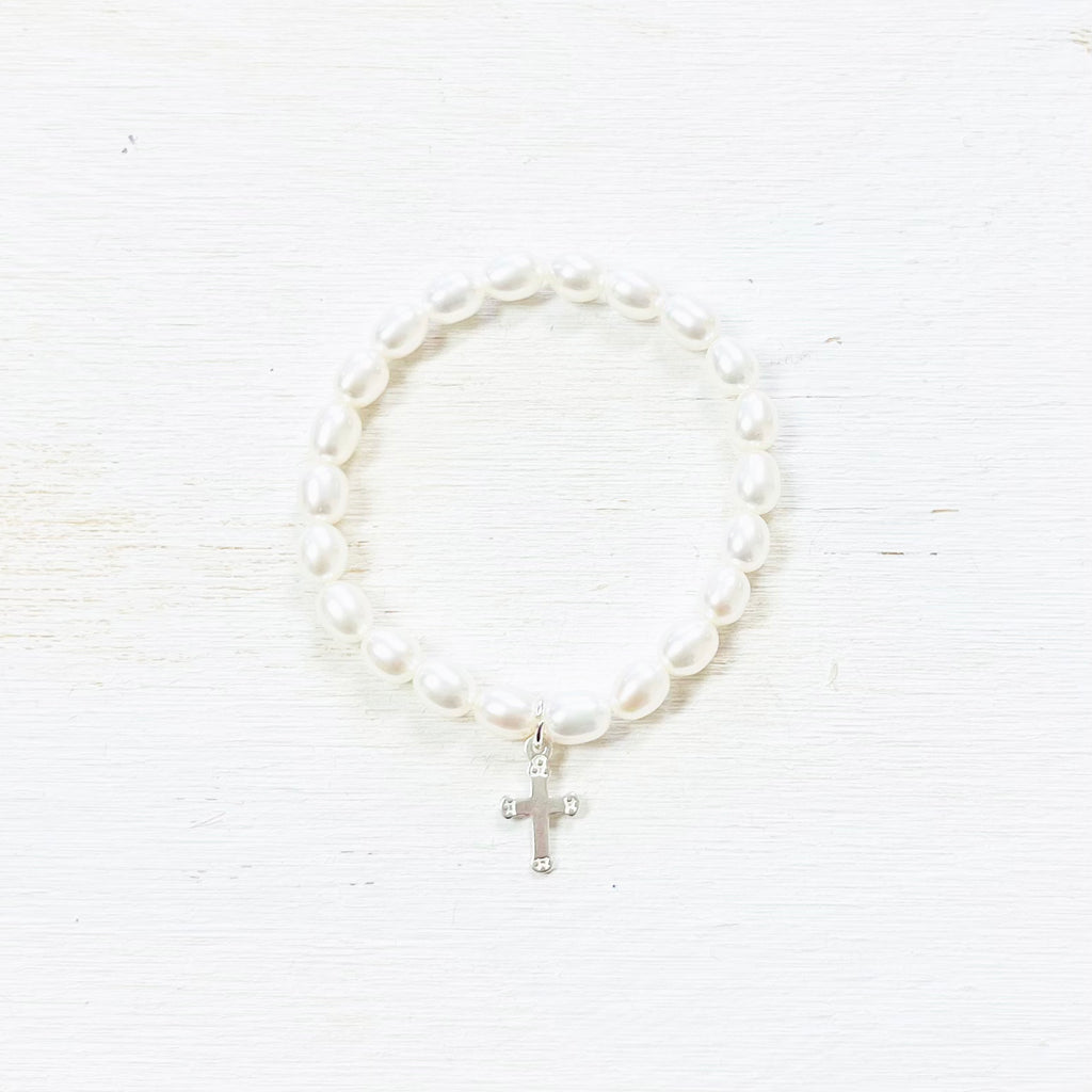 Sterling Silver Children’s Freshwater Pearl Stretch Bracelet w/ Cross Charm