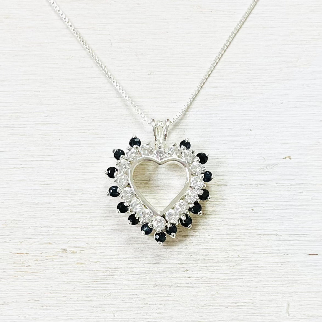 Sterling Silver Estate Black and Clear Stone Heart Necklace