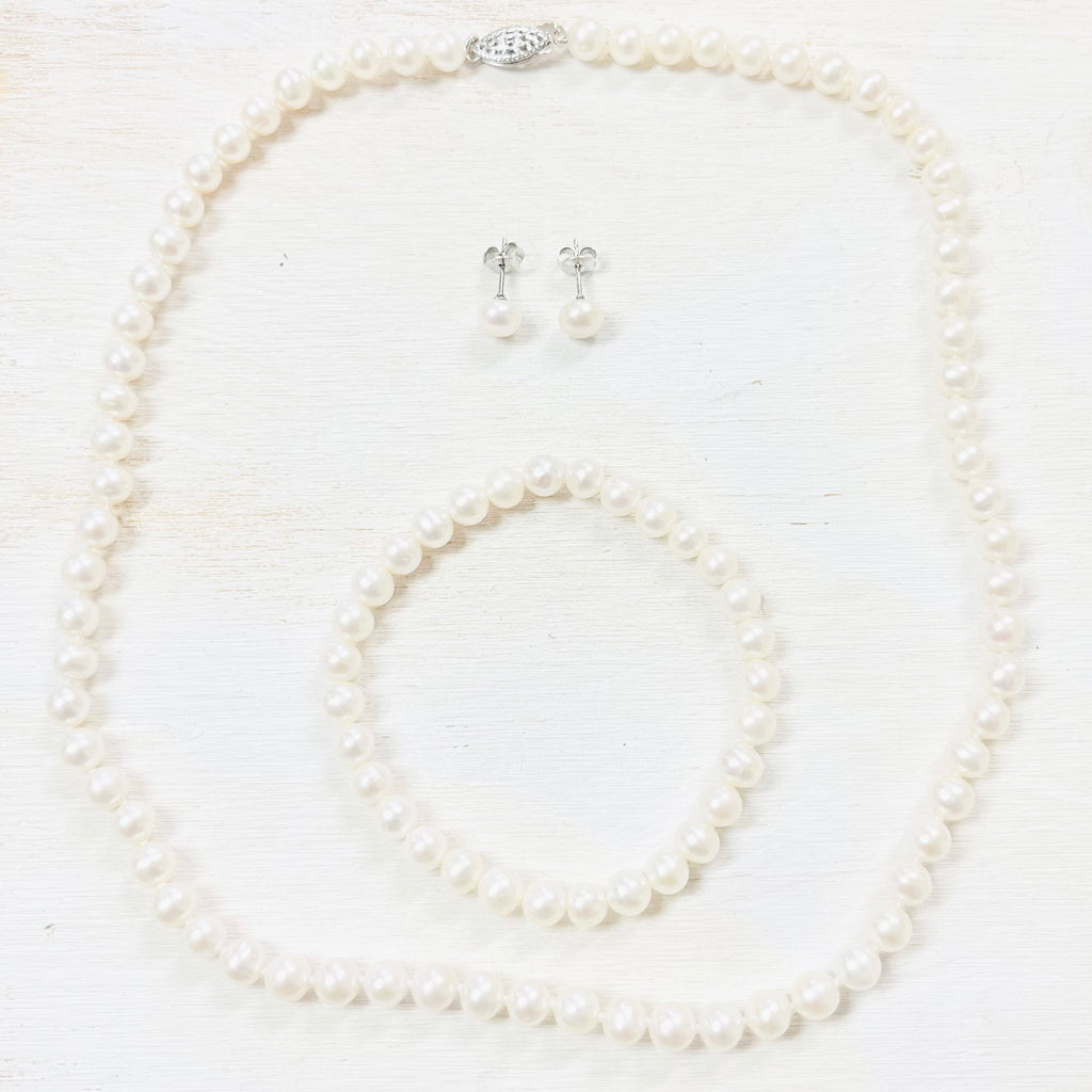 Comes with 18” Necklace, 7” Stretch Bracelet, Pearl Studs