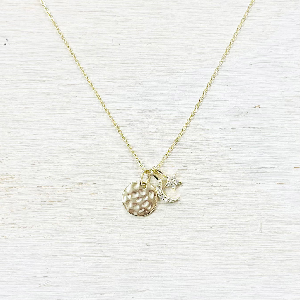 Sterling Silver Gold Plated CZ Moon, Star, and Disc Necklace