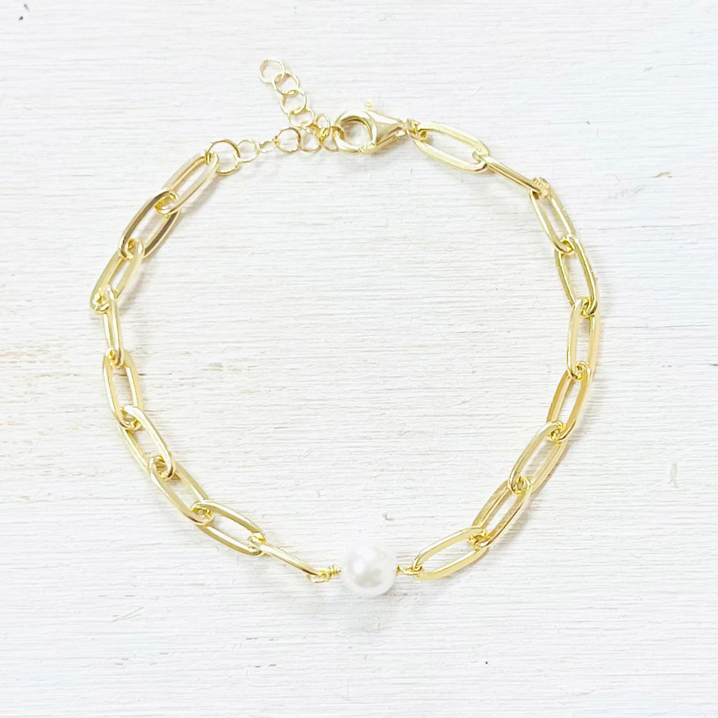 Sterling Silver Gold Plated Paperclip Bracelet w/ Pearl