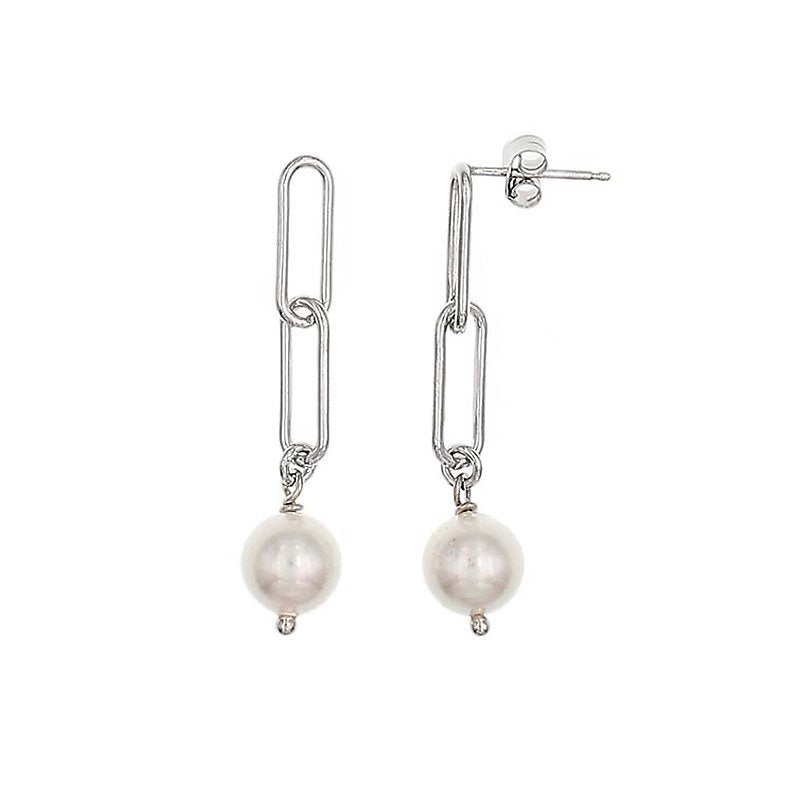 Rhodium plating over sterling silver with 8mm pearls dangling from paperclip links. (40mm total length)