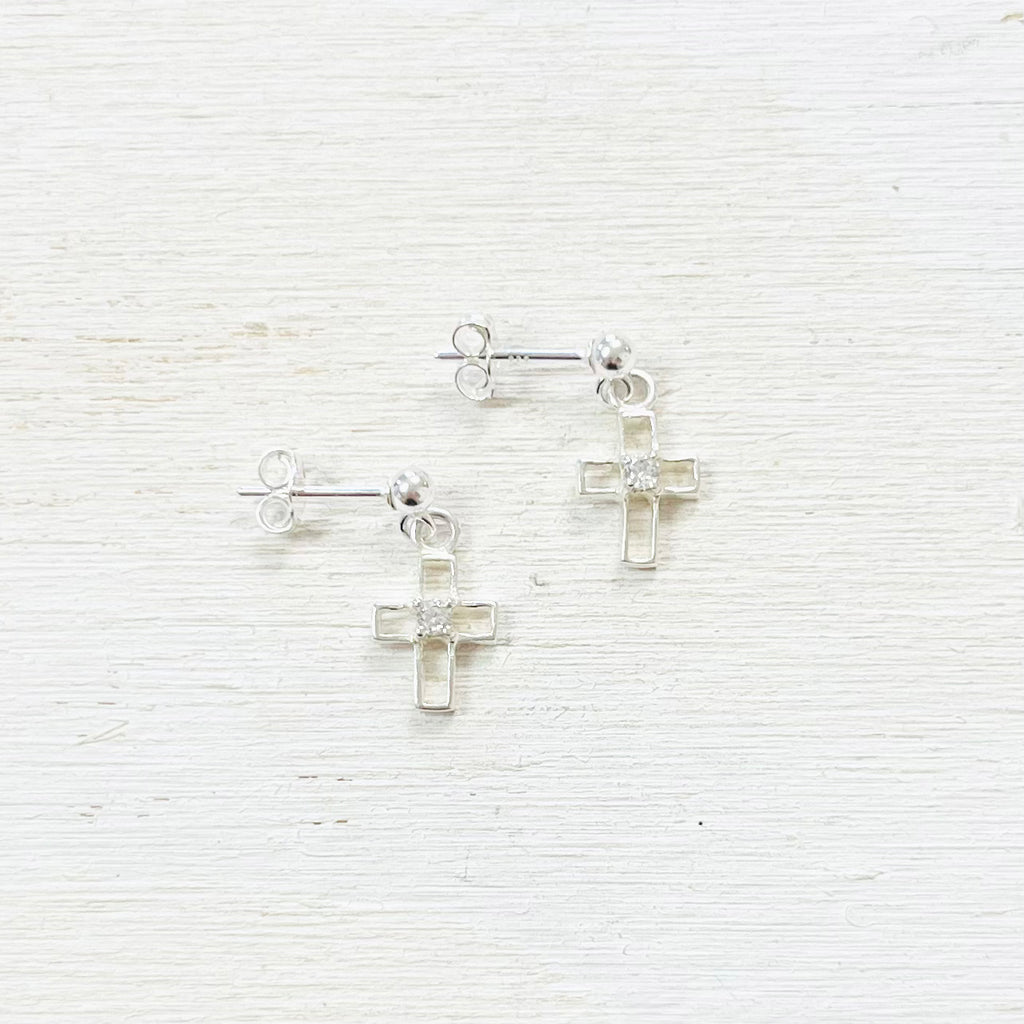 Sterling Silver Dangle Cross Earrings with CZ