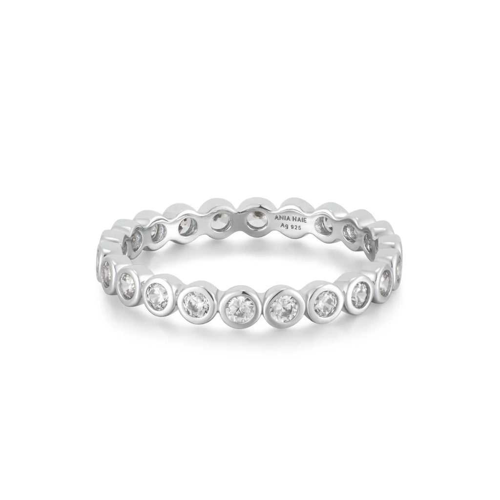 Designed to be a wardrobe essential, the bezel set ring features a band of cubic zirconia in rhodium plated sterling silver. It looks brilliant worn alone or stacked with yours, effortlessly suiting your everyday wear.