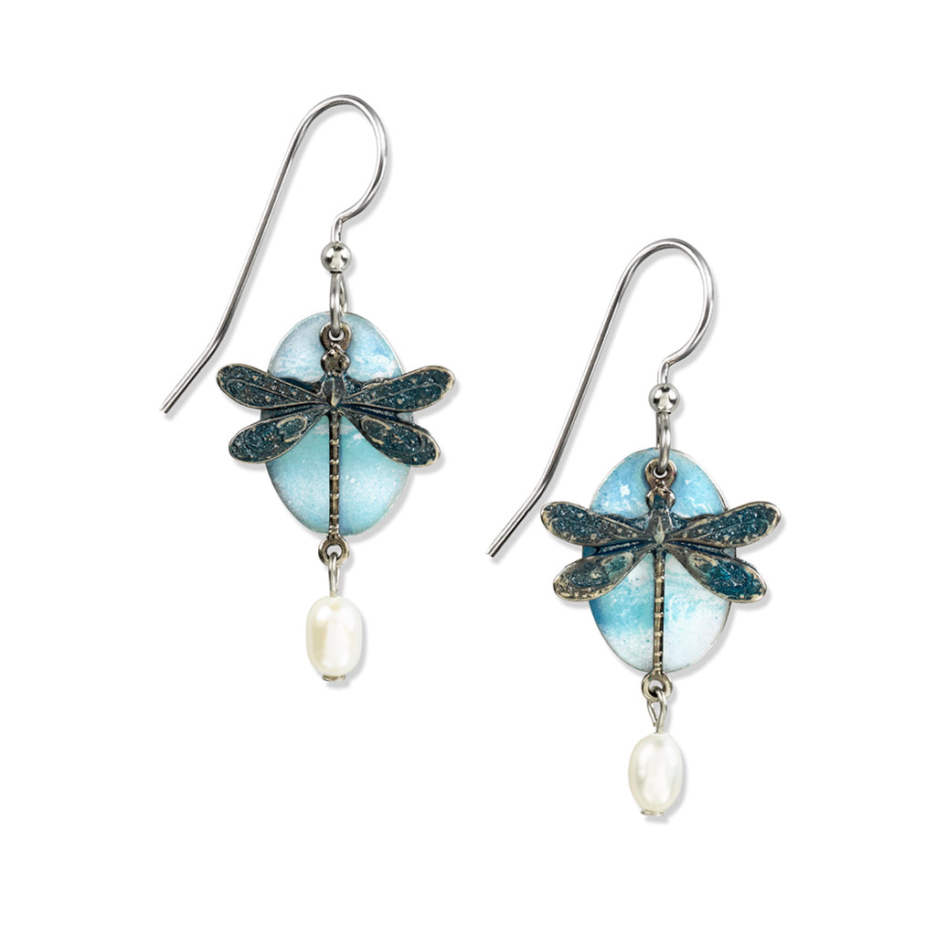 Silver Forest Blue Dragonfly & Pearl Earrings