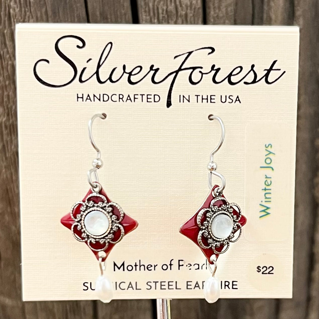 Silver Forest Mother of Pearl and Red Diamond Shape Earrings